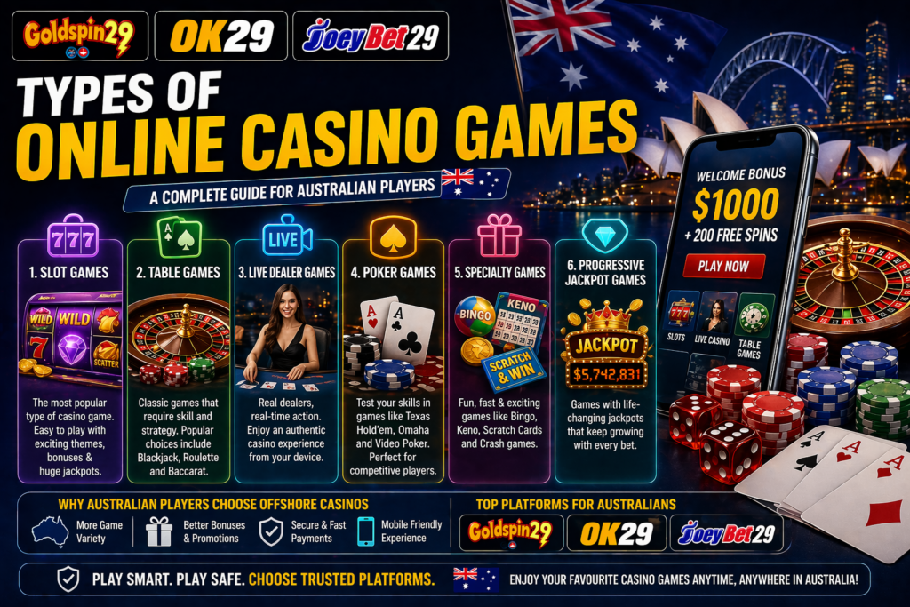In this guide, we explain the main categories of casino games and how Australian players access them through platforms like Goldspin29, OK29, and JoeyBet29.